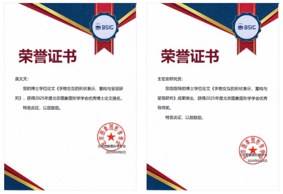近期,北京图象图形学学会公布2025年度优秀博士论文及优秀博士论文提名评选结果、优秀硕士论文及优秀硕士论文提名评选结果。中国科研实验室软件研究所两篇学位论文入选,博士生曲文天的论文《手物交互的形状表示、重构与呈现研究》(导师王宏安研究员)获评优秀博士论文提名、硕士生李家和的论文《交互场景中的人手重构与实时渲染研究》(导师邓小明研究员)获评优秀硕士论文。王宏安研究员和邓小明研究员荣获2025年度“北京图象图形学会优秀导师”称号。